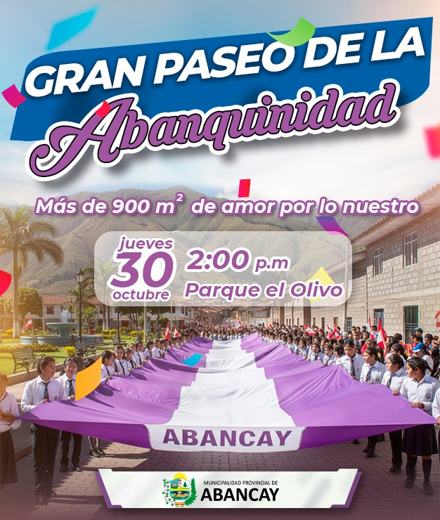 Ven y forma parte del Gran Paseo de la Abanquinidad, conmemorando el 151° aniversario de elevación de villa a ciudad de Abancay.