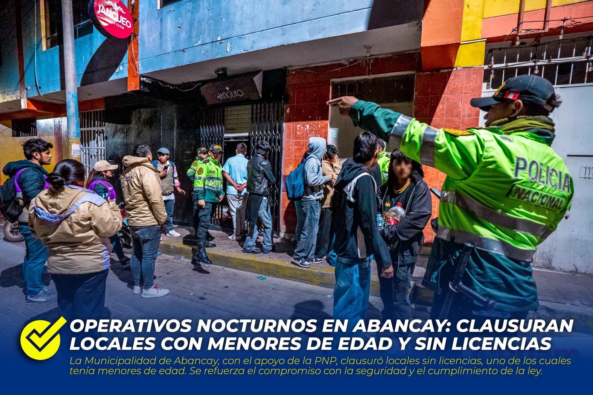 La Municipalidad Provincial de Abancay, a través de la Gerencia de Comunidades Campesinas y su Subgerencia de Comercialización, en coordinación con la Policía Nacional del Perú (PNP), realizó operativos nocturnos en diversos locales nocturnos de la ciudad. El objetivo de estas acciones fue garantizar el cumplimiento de las normativas vigentes, especialmente en lo que respecta a los horarios de funcionamiento y la posesión de las licencias correspondientes.